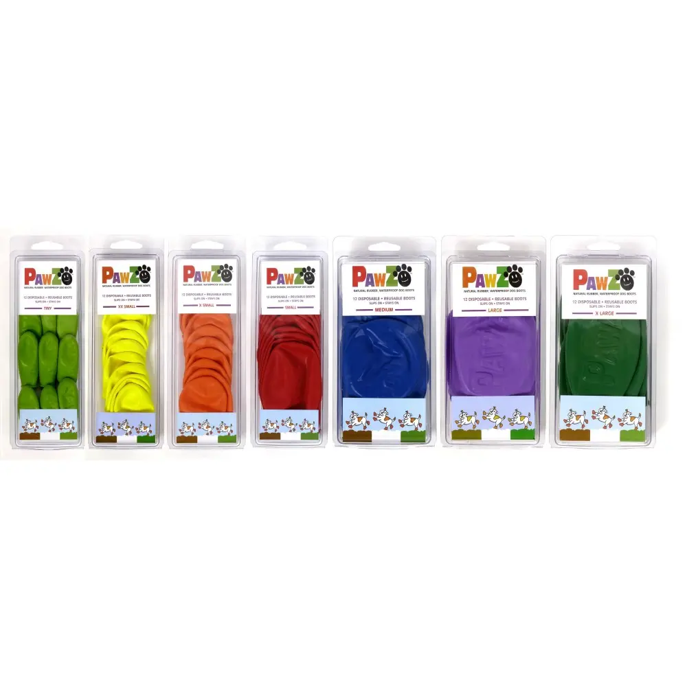 Waterproof and reusable rubber boots for dogs. Very comfortable and easy to put on, made of natural rubber. Suitable for asphalt, sand, earth, snow and rain. The pack contains 12 boots of the same size.